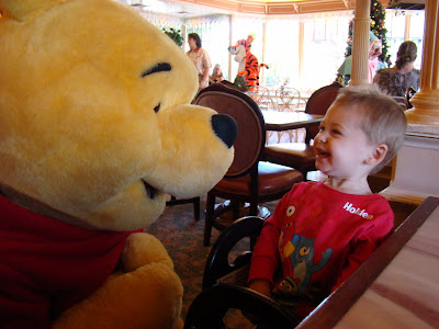On November 11 my mom, Ryan and I took Holden and Maddie on their first trip to Disneyland. We started off the day by going to breakfast with the characters. My friend Tyler, who plays Winnie the Pooh was able to get all his character friends together and give Holden and Maddie some extra attention. We were not sure how Holden would react. As you can see by these pictures he LOVED it!!!!! Our little man was not scared of anything